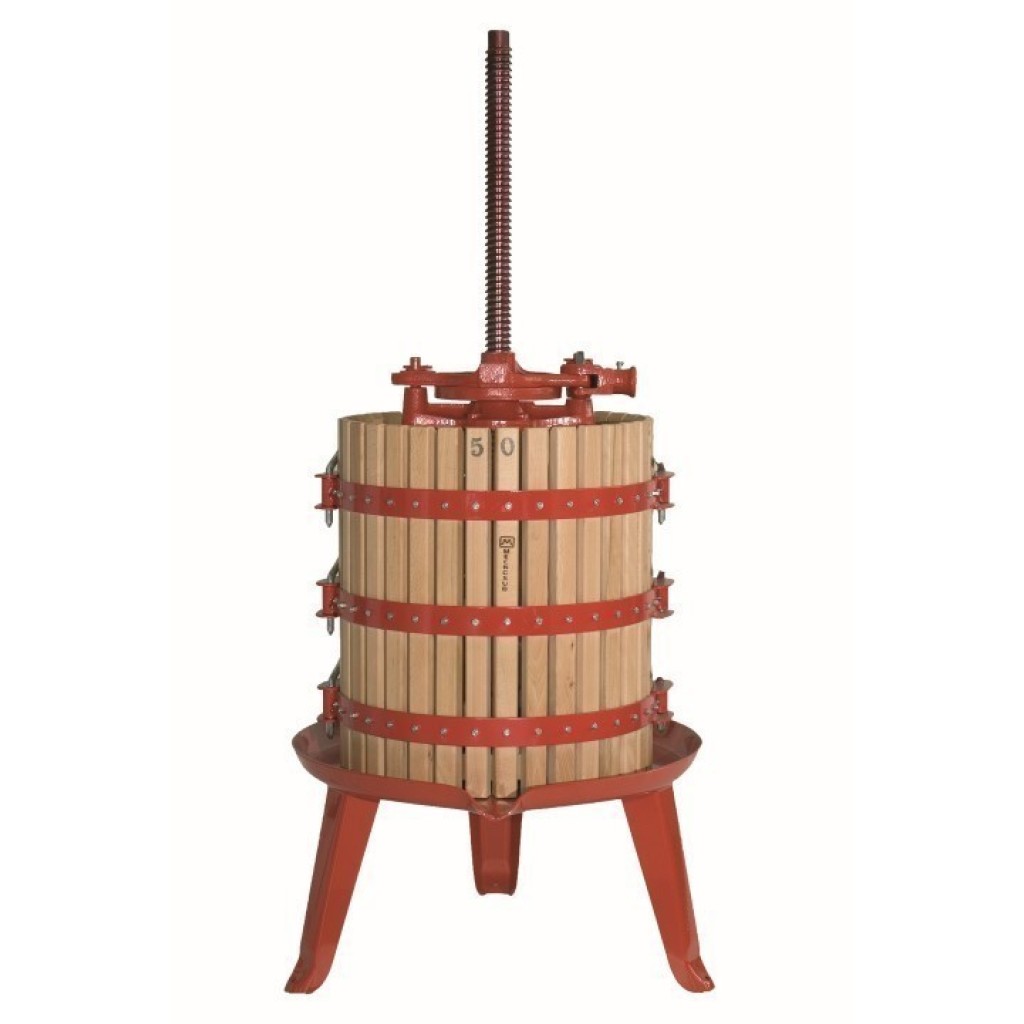 Χειροκίνητο Σταφυλοπιεστήριο με κοχλία διαμέτρου 45mm. Το Σταφυλοπιεστήριο αποτελεί το βασικότερο μηχάνημα παραγωγής κρασιού, καθώς σας επιτρέπει να στίψετε περαιτέρω τα στέμφυλα μετά τη ζύμωση. Το Σταφυλοπιεστήριο αυτό κατασκευάζεται εξ' ολοκλήρου από την Polsinelli με υψηλής ποιότητας υλικά κατασκευής. Ο κοχλίας είναι κατασκευασμένος από ατσάλι, ενώ το βαρέλι είναι κατασκευασμένο από εμποτισμένες σανίδες με αφαιρούμενες ασφάλειες. Μηχανισμός κίνησης δύο ταχυτήτων από χυτοσίδηρο. Βάση κατασκευασμένη από ενισχυμένο ατσάλι με πόδια στήριξης.