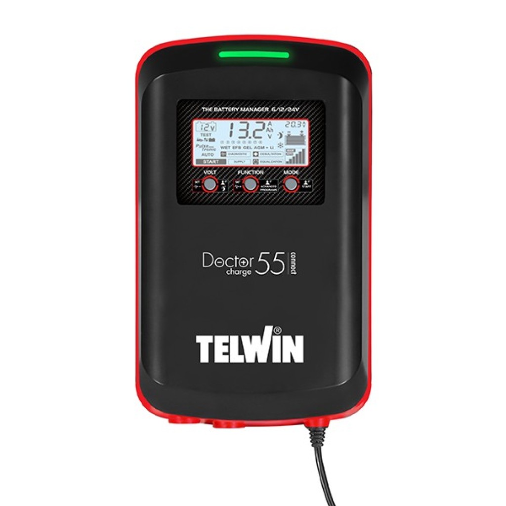 Ηλεκτρονικός Διαχειριστής Μπαταριών TELWIN DOCTOR CHARGE 55 CONNECT για αυτόματη φόρτιση – συντήρηση (PULSE TRONIC), εκκίνηση των WET, GEL, AGM, MF, PbCa, EFB και Li μπαταριών ισχύς 6/12/24V. Ανάκτηση θειωμένων ή των πολύ αποφορτισμένων μπαταριών και για ενέργειες υποστήριξης όταν παρεμβαίνουμε σε οχήματα μέσα σε συνεργεία επισκευής ή καταστήματα εμπόρων αυτοκινήτων. Είναι πολύ εύκολος στη χρήση, χάρη στην αυτόματη αναγνώριση του τύπου της μπαταρίας και στην παρουσία ενός φιλικού προς το χρήστη πληκτρολογίου. Η πρωτοποριακή τεχνολογία POWER STREAM εγγυάται καλύτερη απόδοση, έως και 50% παραπάνω σε σχέση με τους παραδοσιακούς φορτιστές μπαταρίας χάρη στον πιο αποτελεσματικό και πλήρη έλεγχο της διαδικασίας φόρτισης, κυρίως σε ταχύτερους χρόνους φόρτισης και τη συντήρηση των βέλτιστων συνθηκών της μπαταρίας, οι οποίες εγγυώνται μεγαλύτερη διάρκεια εργασίας. Η τεχνολογία Pulse Tronic εγγυάται την ιδανική φόρτιση της μπαταρίας σε 8 φάσεις που ελέγχουν, παρακολουθούν, αυξάνουν και διατηρούν την κατάσταση φόρτισης.