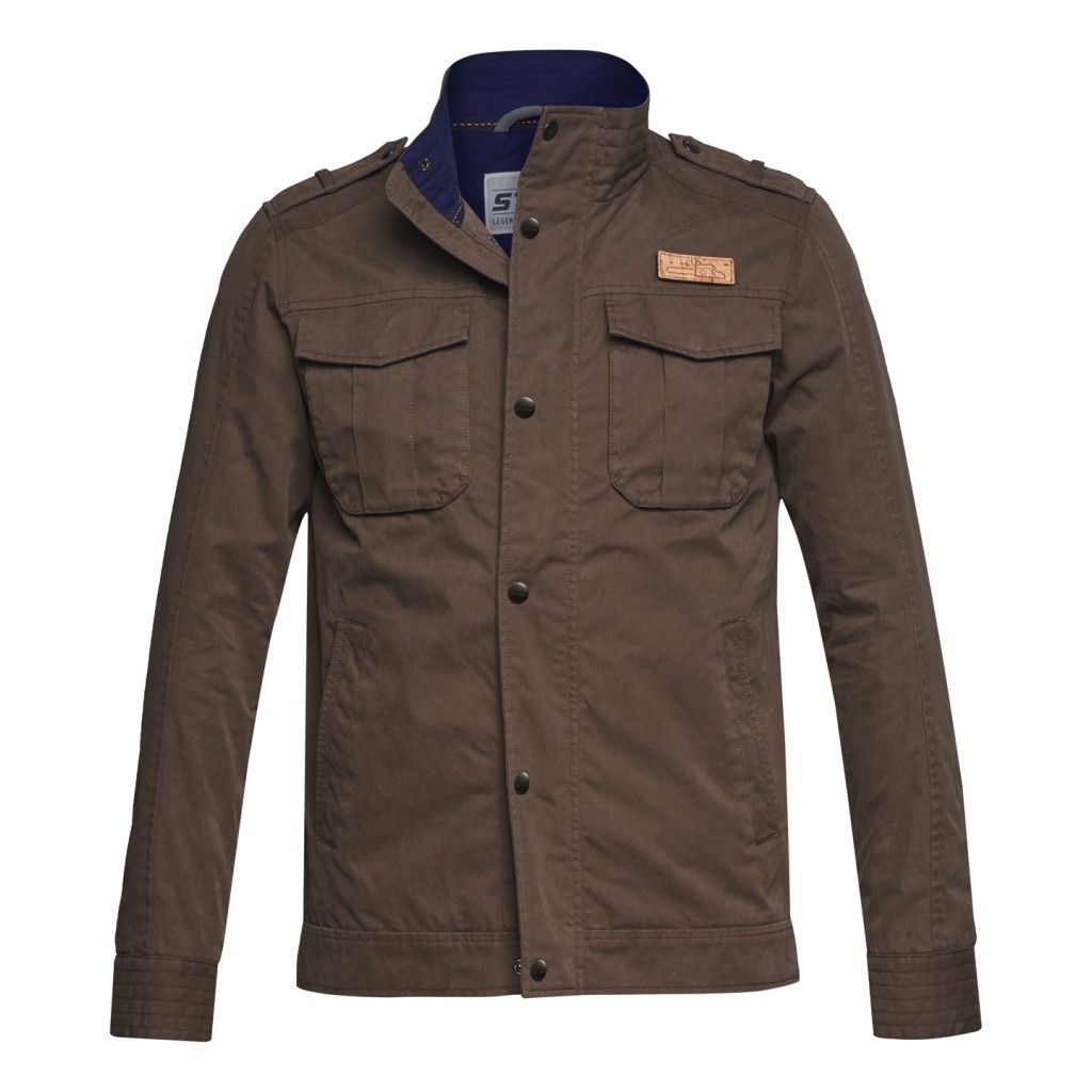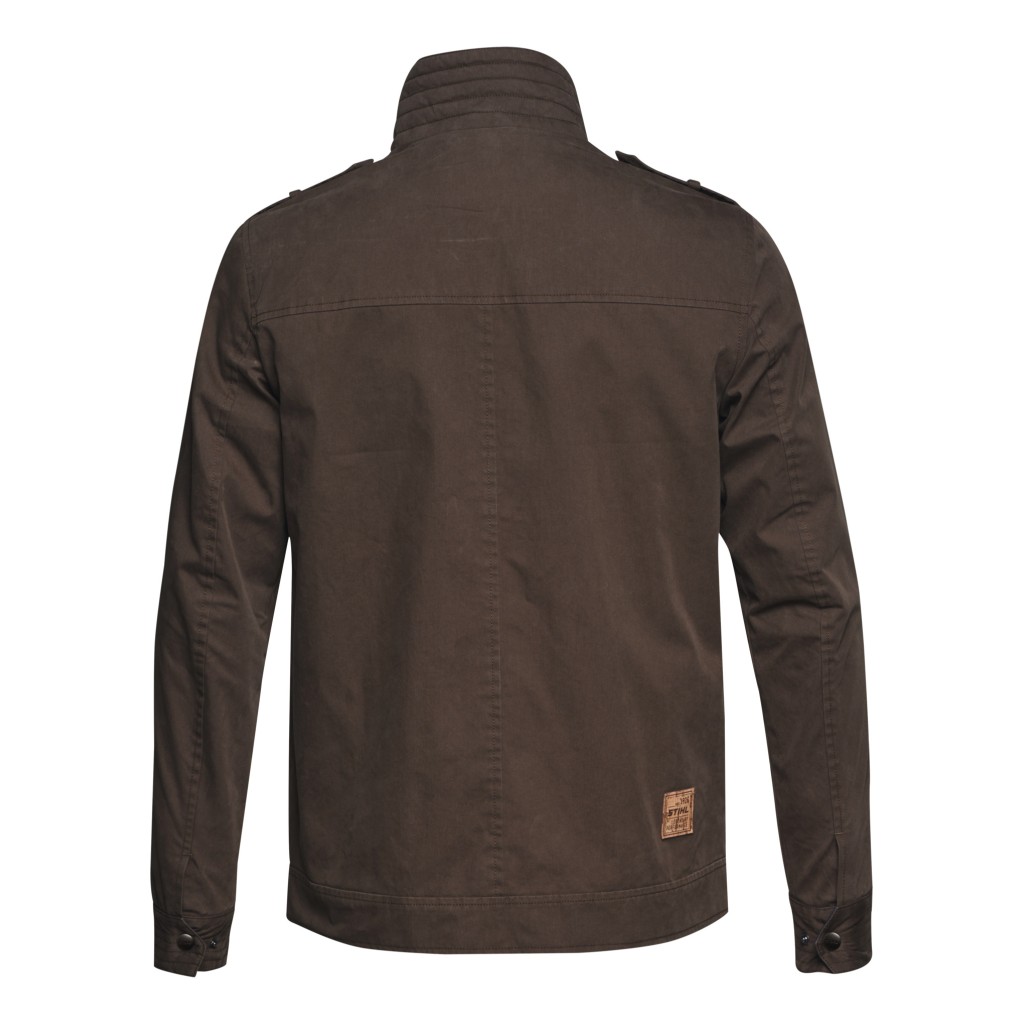 Αυτό το καφέ σακάκι στρατιωτικού τύπου από 59% βαμβάκι, 39% πολυαμίδιο, 2% πολυεστέρα μπορεί να προσαρμοστεί με τρία εναλλάξιμα σήματα: ένα σήμα από φελλό με αλυσοπρίονο και υφαντά σήματα με τσεκούρι και CONTRA. Όλα μπορούν να φυλαχθούν με τάξη στις δύο τσέπες στο στήθος και στις δύο πλαϊνές τσέπες. Το καλυμμένο φερμουάρ, οι επωμίδες και η μπλε φόδρα καμουφλάζ αλυσοπρίονου είναι λεπτομέρειες σχεδιασμένες με αγάπη, που κάνουν αυτό το μπουφάν απαραίτητο κομμάτι σε κάθε ντουλάπα.
