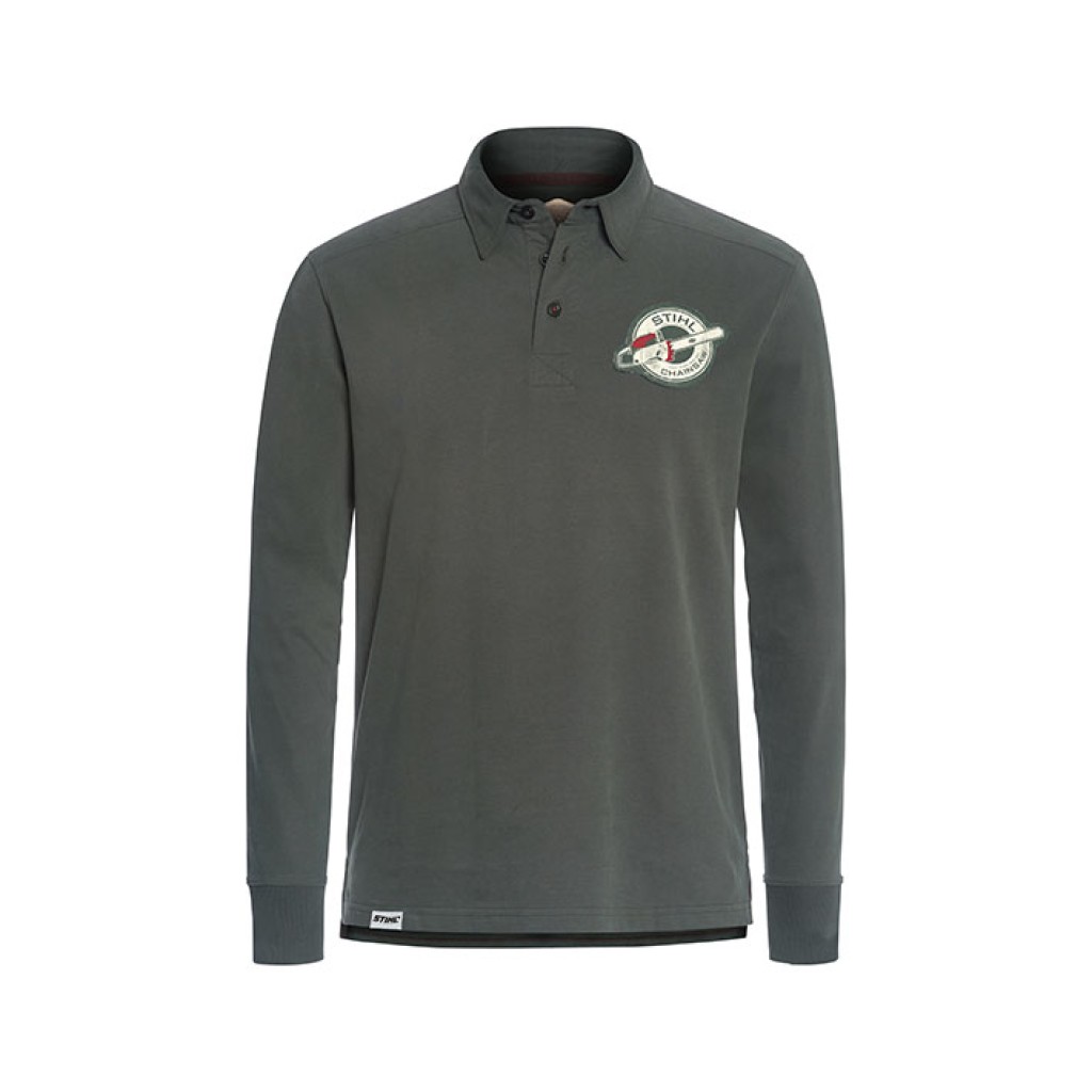 Σκούρο πράσινο, 100% βαμβάκι, ζέρσεϊ μονής όψης, μακριά μανίκια, γιακάς με πατιλέτα, κεντημένο σχέδιο του αλυσοπρίονου Contra και επιγραφή «STIHL Chainsaw» στην αριστερή πλευρά του θώρακα. Μεγέθη S-XXL.