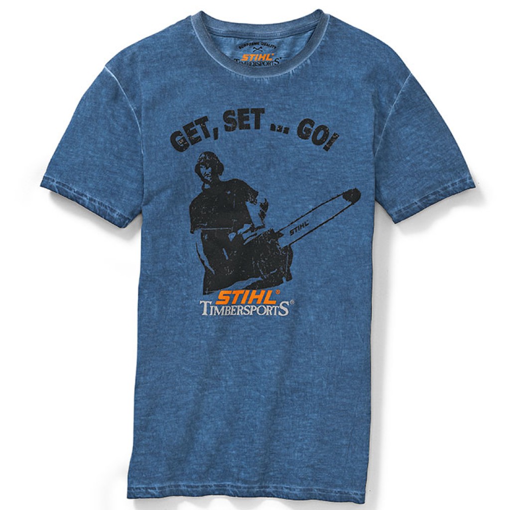 Γκρι-μπλε, 100% βαμβάκι, ξεβαμμένη γραφική εκτύπωση στο μπροστινό μέρος, ετικέτα θηλιάς STIHL TIMBERSPORTS® στο κάτω στρίφωμα.
