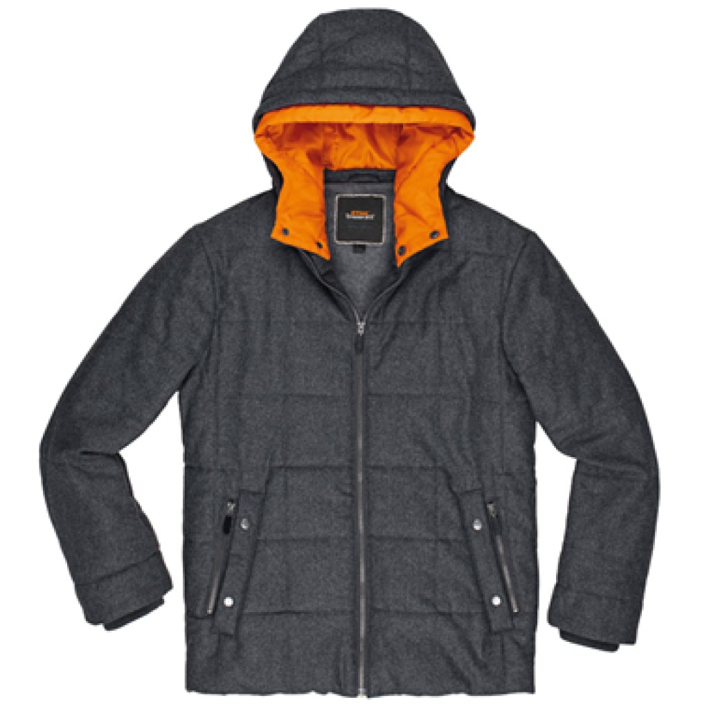 Ελαφρύ και ζεστό μπουφάν. 50% μαλλί, 50% πολυεστέρας, πορτοκαλί φόδρα κουκούλας από 100% πολυεστέρα, εσωτερικός γιακάς και φόδρα του μπουφάν από φλις, η φόδρα κουκούλας αφαιρείται με φερμουάρ και σούστες, σχισμή αέρα στα μανίκια, πλαϊνές τσέπες με φερμουάρ, τσέπες με ετικέτες με φερμουάρ, τσέπη εγγράφων με σούστα, τσέπη κινητού τηλεφώνου με ταινία βέλκρο, μεταλλικό σήμα με ανάγλυφη επιγραφή STIHL TIMBERSPORTS® στο αριστερό μανίκι.