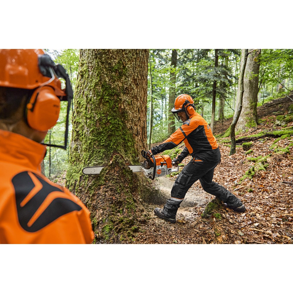 Ακόμα και η εκκίνηση του βενζινοκίνητου αλυσοπριόνου STIHL MS 881 πρέπει να είναι όσο το δυνατόν πιο απλή. Γι’ αυτό είναι εφοδιασμένο με βαλβίδα αποσυμπίεσης και σύστημα STIHL ElastoStart, που διευκολύνουν αισθητά τη διαδικασία εκκίνησης. Ο μονός μοχλός χειρισμού επιτρέπει έλεγχο όλων των λειτουργιών με το ένα μόνο χέρι, ώστε να μη χρειαστεί να απομακρύνετε το δεξί σας χέρι από τη λαβή. Το αντιδονητικό σύστημα STIHL μειώνει αισθητά τους κραδασμούς που φτάνουν στις λαβές, προστατεύοντας τους μύες και τις αρθρώσεις σας,ενώ το φίλτρο αέρα HD2 από πολυαιθυλένιο συγκρατεί μέχρι και την πιο λεπτή σκόνη, διατηρώντας τον κινητήρα σας καθαρό. Το φίλτρο καθαρίζεται αποτελεσματικά και μπορεί να αντικατασταθεί χωρίς τη χρήση εργαλείων. Προκειμένου να αποφευχθεί η επαφή ανάμεσα στα χέρια σας και την αλυσίδα ή τα νύχια στήριξης, η βίδα για το τέντωμα της αλυσίδας βρίσκεται στο πλάι. Χάρη στον διακόπτη λειτουργίας, μπορείτε να σταματήσετε το αλυσοπρίονο με το πάτημα ενός κουμπιού. Σταματώντας το STIHL MS 881, αυτόματα επανέρχεται στη θέση εκκίνησης, επιτρέποντας άμεση επανεκκίνηση.