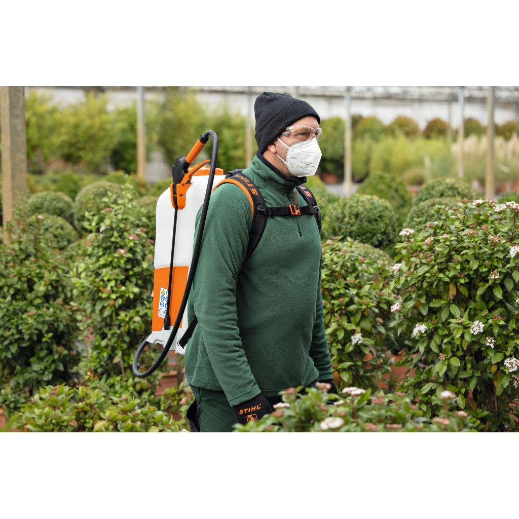 The powerful STIHL SGA 85 cordless garden sprayer is the first battery-powered sprayer in the STIHL range to support professional users in the efficient application of pesticides or fertilisers. The high working pressure and large, 17-litre transparent container with gauge make the STIHL SGA 85 the ideal companion for landscapers and farmers, even in tackling challenging tasks and large-scale crops such as fruit-growing or viticulture. Carrying the lightweight 6.2 kg pressurised spray pack, you can easily and flexibly adjust the working pressure from 1 bar to 6 bar using a dial. The particularly comfortable carrying system with individually adjustable back straps and height-adjustable chest strap make this sprayer comfortable to use, even for longer periods. Equipped with a brass hollow-cone nozzle, the STIHL SGA 85 cordless sprayer will help you to apply the respective liquid with precision. The integrated filter element prevents dirt from getting into the spray lance from the tank, and can be cleaned easily when replacing the nozzle. A holster on the optionally available STIHL hip belt for the SGA 85 enables safe stowing of the spray lance during breaks in work.
