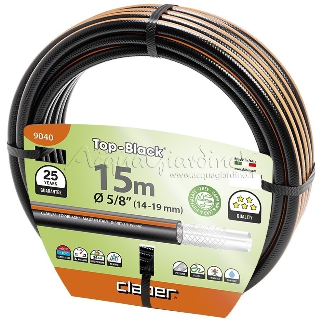 Claber Λάστιχο Κήπου Μαύρο Top-Black 5/8¨ – 15m – 9040 με διάμετρο τρύπας – εσωτ. 14mm – εξωτ. 19mm.